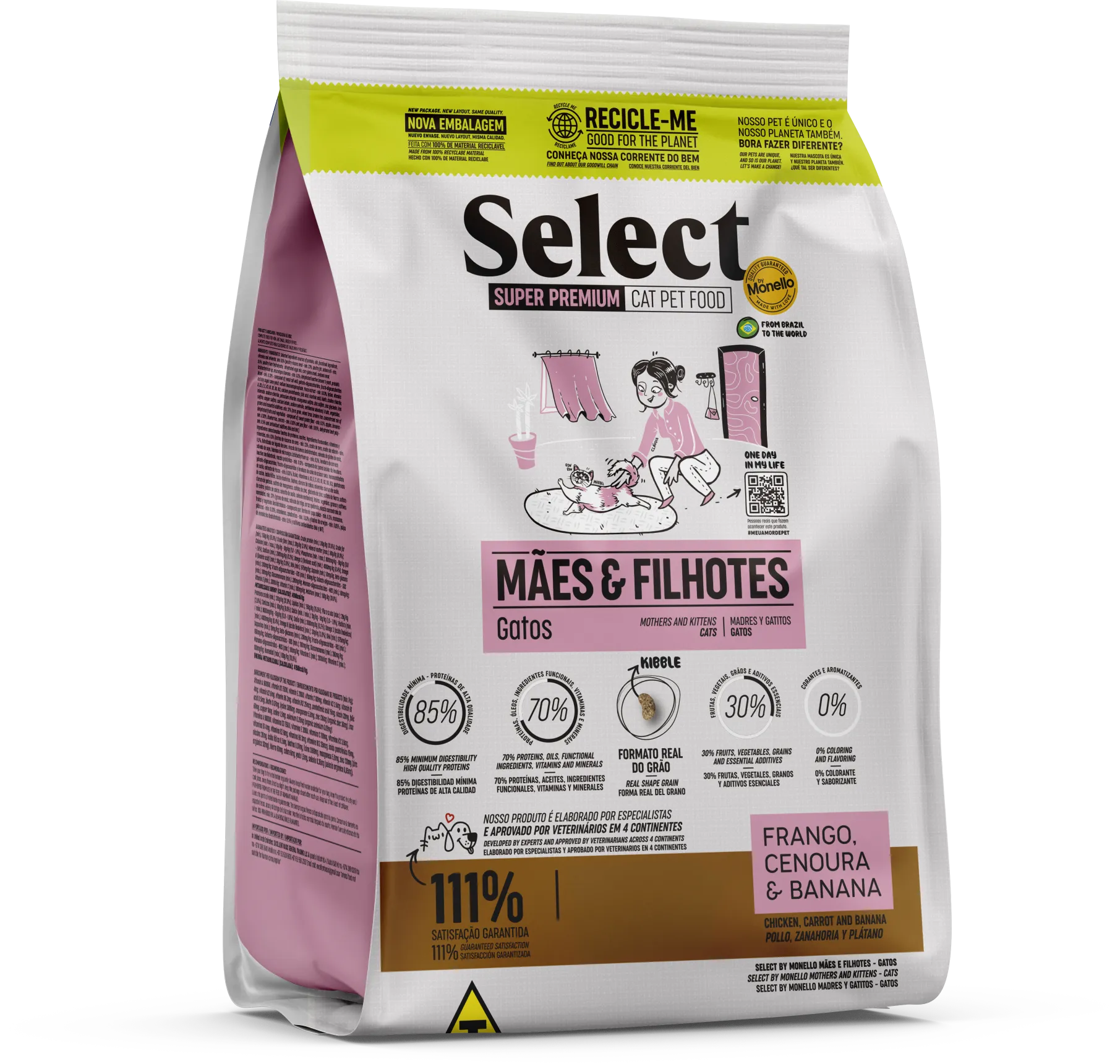 - Selected ingredients sources of proteins, oils, functional ingredients, vitamins and minerals, min. 70% (poultry viscera meal – min. 23%, salmon meal, poultry fat, salmon oil - min. 1%, poultry liver hydrolysate, dehydrated eggs mix, corn gluten meal, soybean meal, Schizochytrium sp. microalgae biomass – min. 0.4%, dehydrated inactive brewer’s yeast, prebiotic blend – min. 0.1% - composed of: yeast cell wall, galacto-oligosaccharides, fructo-oligosaccharides and dry sugar cane yeast, sodium hexametaphosphate, Yucca extract, methionine, taurine, vitamins A, D3, E, C, K3, B1, B2, B6, B12, calcium pantothenate, folic acid, nicotinic acid, biotin, choline chloride, minerals sodium chloride, potassium chloride, manganese sulfate, zinc sulfate, zinc glycinate, iron sulfate, copper sulfate, calcium iodate, sodium selenite, methionine selenium). Fruits, vegetables, grains and essential additives, min. 30% (broken rice, corn grain, wheat bran, concentrated mix of dehydrated fruits and vegetables – composed of: sweet potato flour, apples, bananas - min. 0.03%, blueberries - min. 0.01%, carrots - min. 0.03% and pea flour - min. 0.05%, dehydrated beet pulp - min. 0.5%, phosphoric acid and antioxidant additives BHA and BHT).
