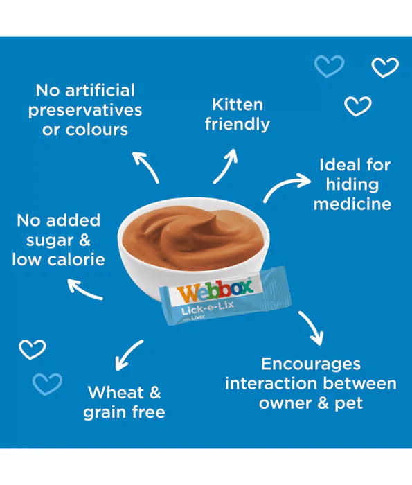 Made with a soft yoghurt-like texture, Webbox Lick-e-Lix with Liver are the unique treat for your cat. Feed as a tasty treat, use as a topping or disguise crushed up tablets for your cat. These tasty and nutritious sachets make the perfect daily treat that your cat will simply adore!